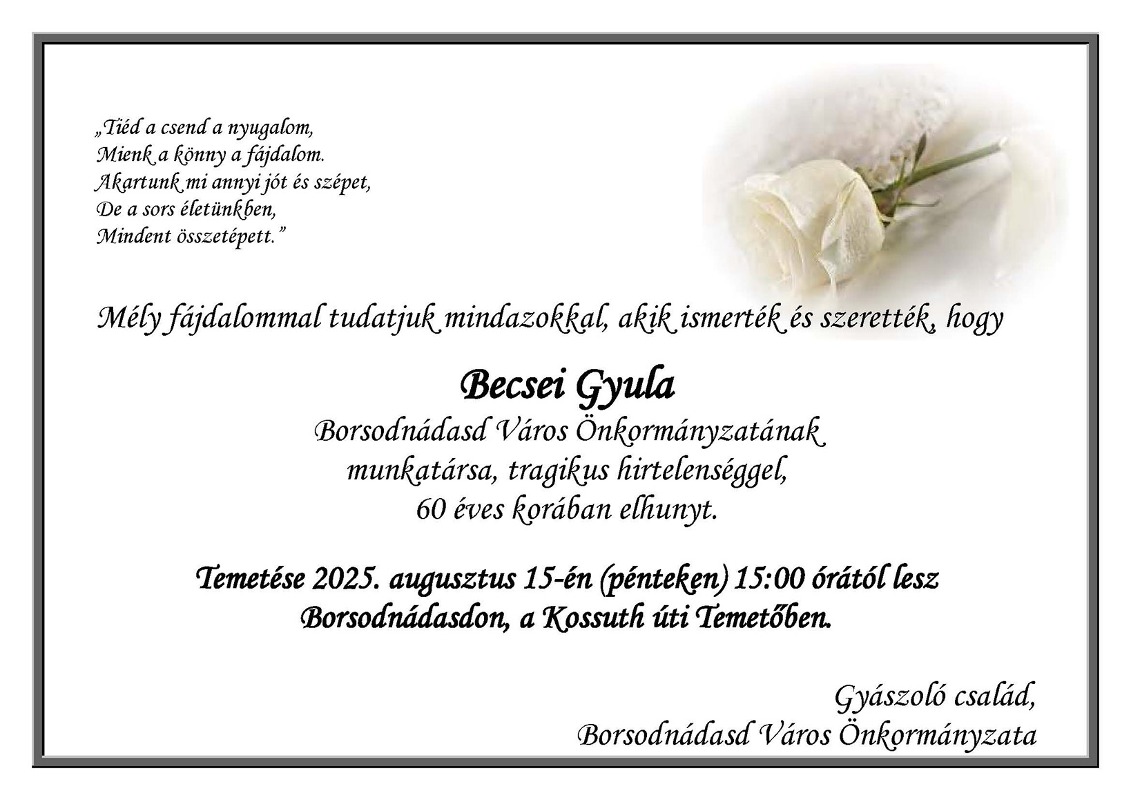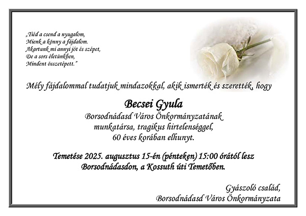 Tájékoztatjuk a Tisztelt Ügyfeleket, hogy a Borsodnádasd Város Önkormányzata Képviselő-testületének 54/2025.(VI.25.) számú KT határozata alapján a