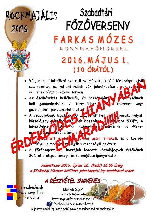 A Főzőverseny ÉRDEKLŐDÉS HIÁNYÁBAN ELMARAD, ezért a délelőtti programok sem kerülnek megrendezésre! A Rockmajálisra 15.00-tól Szeretettel várunk minden kedves érdeklődőt!