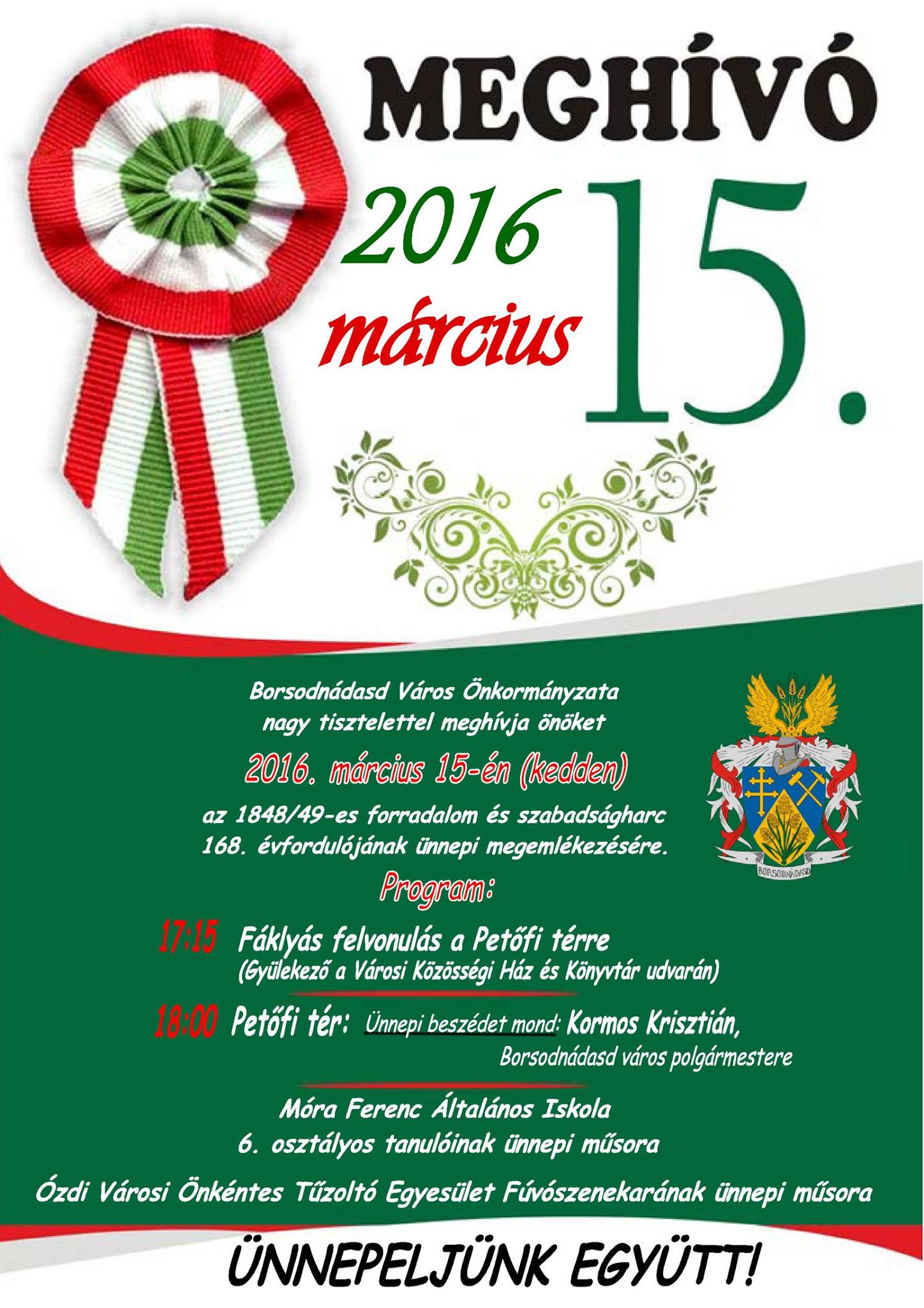 Az időjárásra való tekintettel a fáklyás felvonulás elmarad! Az ünnepi megemlékezés 17:15-től a Borsodnádasdi Közösségi Ház és Könyvtár dísztermében kerül megtartásra! Koszorúzás az ünnepség után (várhatóan 18:00) a Petőfi téren.