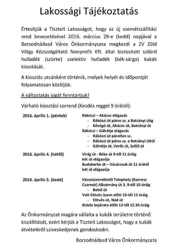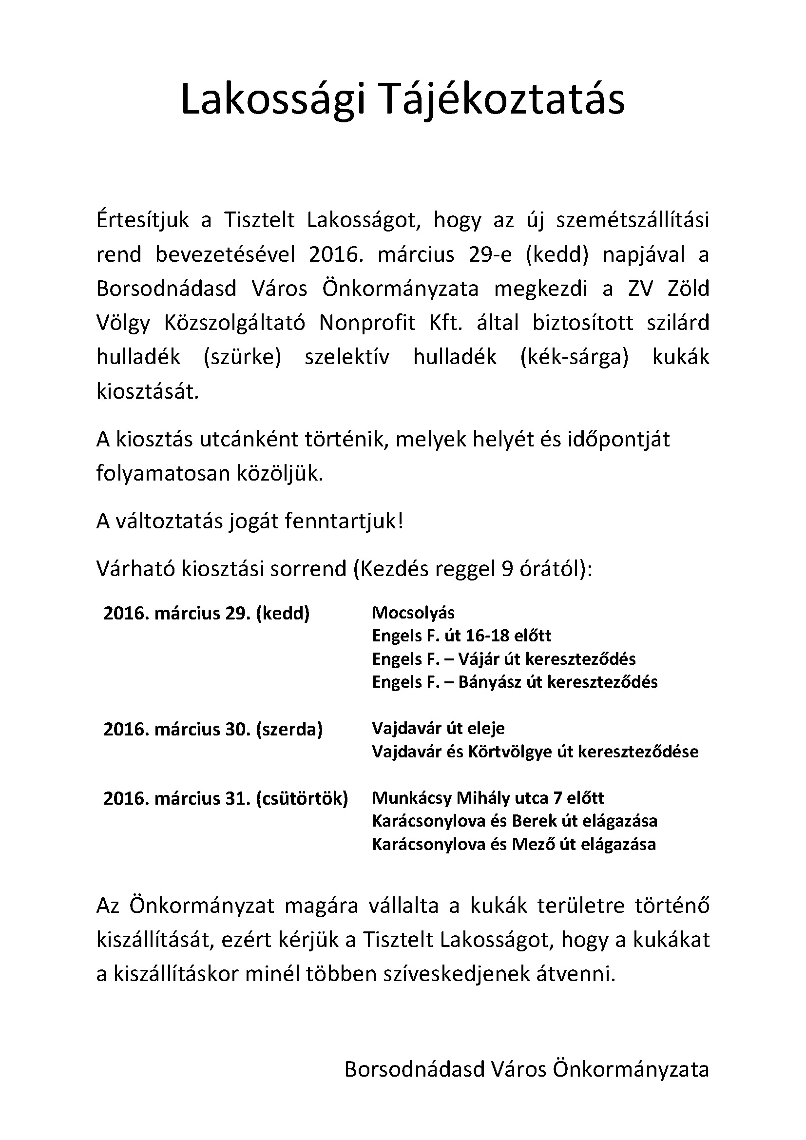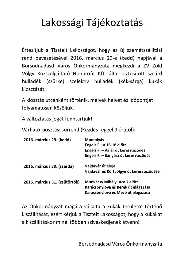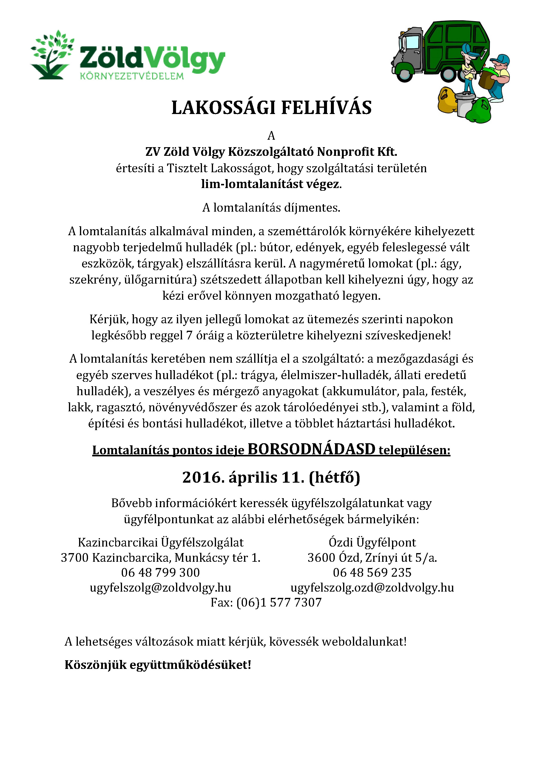 ZV Zöld Völgy Közszolgáltató Nonprofit Kft. tájékoztatja a Tisztelt Lakosságot, hogy Borsodnádasd településen 2016. március 28-án (Húsvét hétfőn) a lakossági hulladék szállítás a szokott időpontban történik, függetlenül az ünnepnaptól. A megszokott helyre a megfelelő időpontban a hulladékgyűjtő edényeket kihelyezni szíveskedjenek!