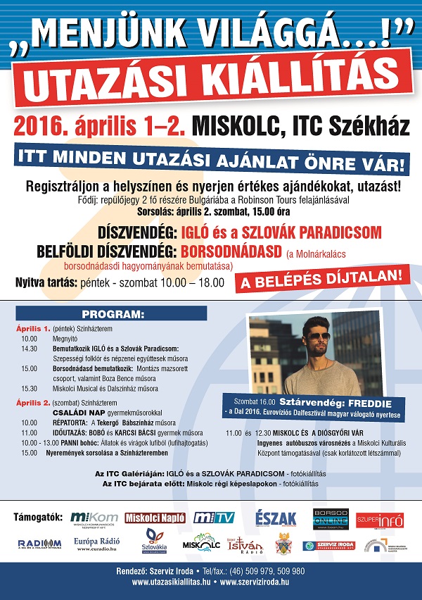 2016. április 1-2. között kerül megrendezésre 23. alkalommal a „Menjünk világgá…!” Utazási Kiállítás Miskolcon.