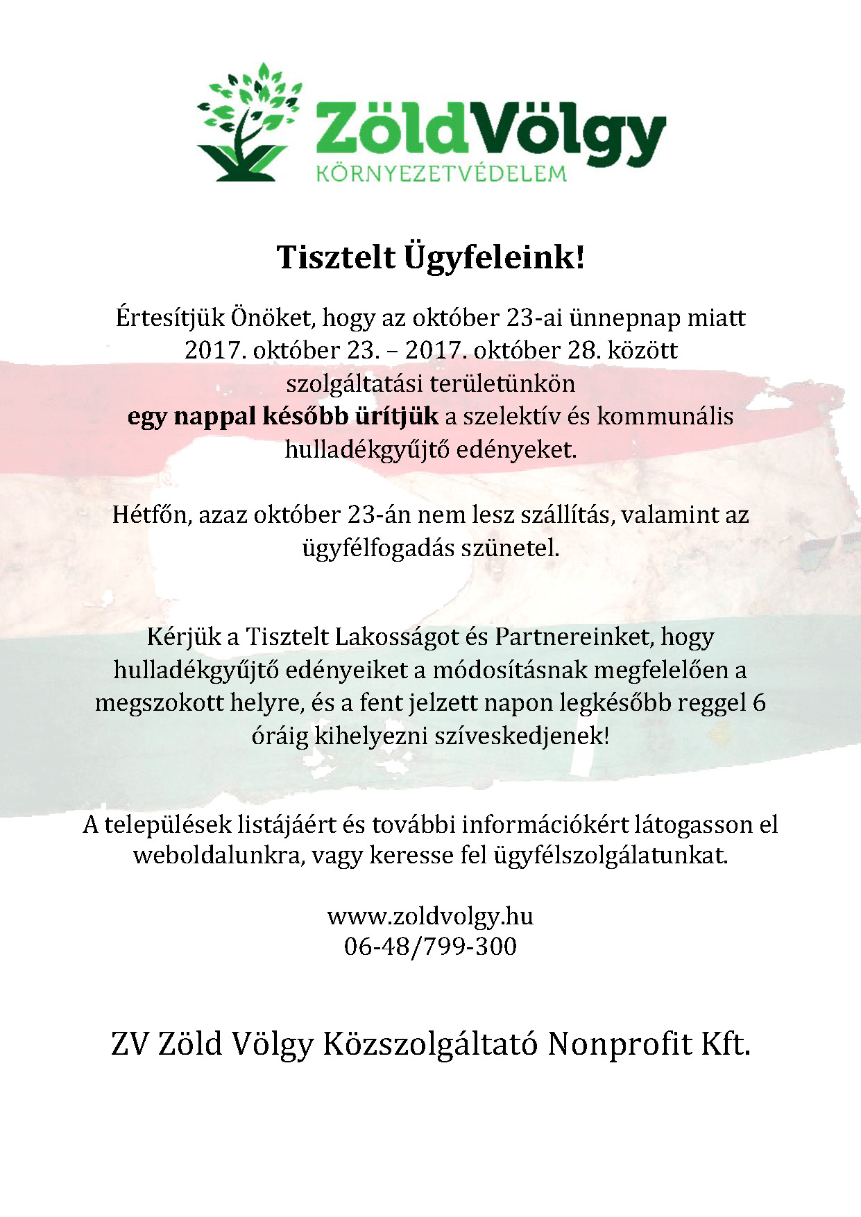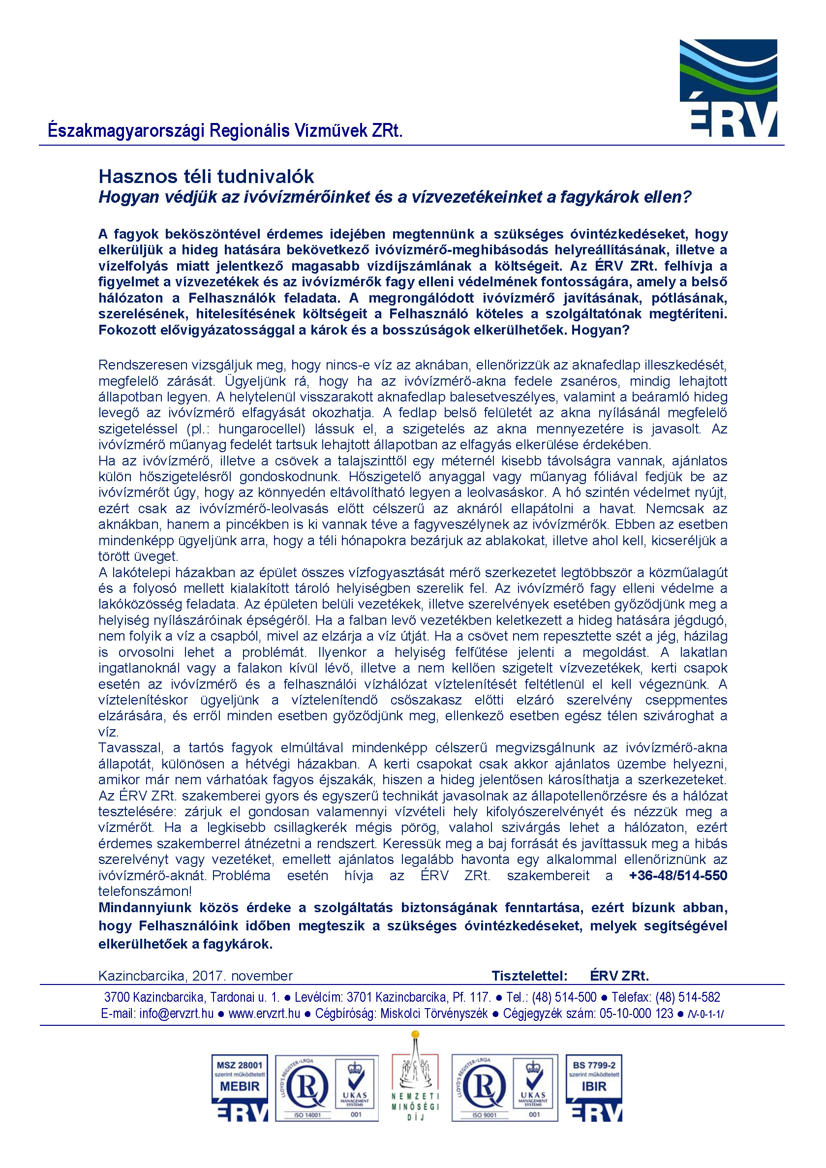 Az ÉRV ZRT. értesíti a Tisztelt Lakosságot,