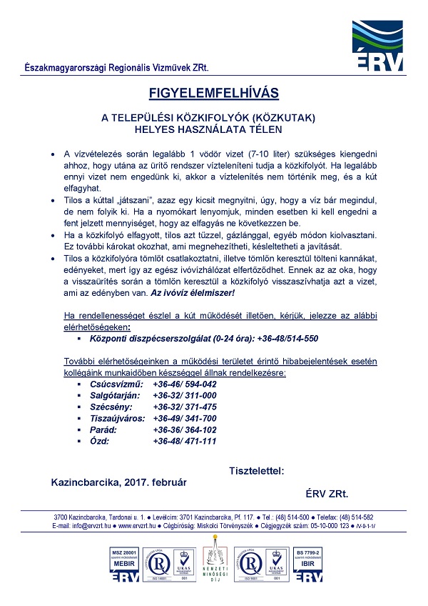 ÉRV ZRt. - Figyelemfelhívás: "A települési közkifolyók (közkutak) helyes használata télen”