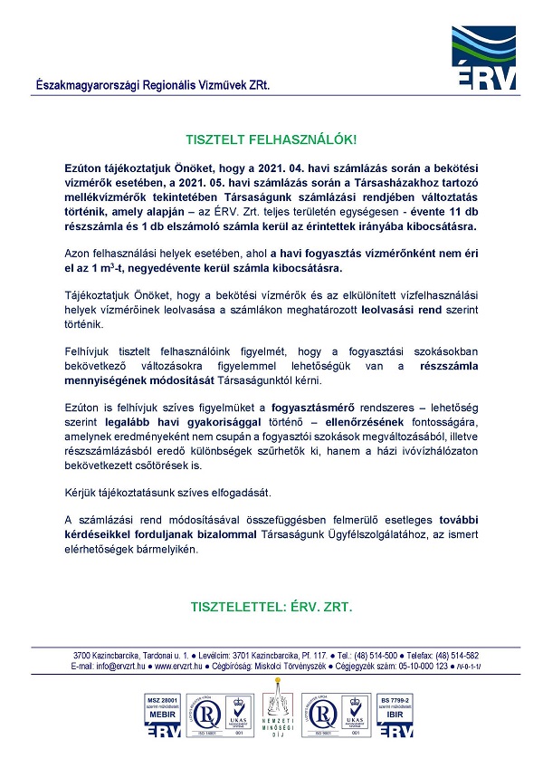 Ezúton nyújtunk tájékoztatást arról, hogy a koronavírus-járványra való tekintettel, a fertőzésveszély kockázatának csökkentése érdekében, az Önök és a Munkavállalóink védelmében – összhangban a kormányzati intézkedésekkel - 2021. március 8-tól előreláthatólag 2021. március 22-ig Társaságunk a mellékvízmérőkkel kapcsolatos alábbi műszaki tevékenységeket felfüggeszti: