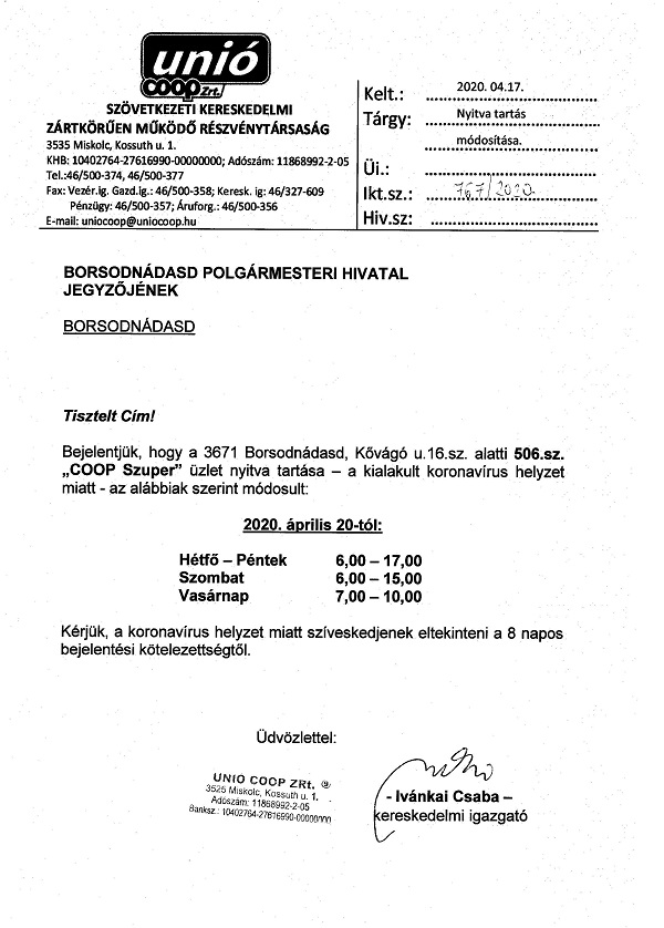 A borsodnádasdi Coop üzlet új nyitva tartása