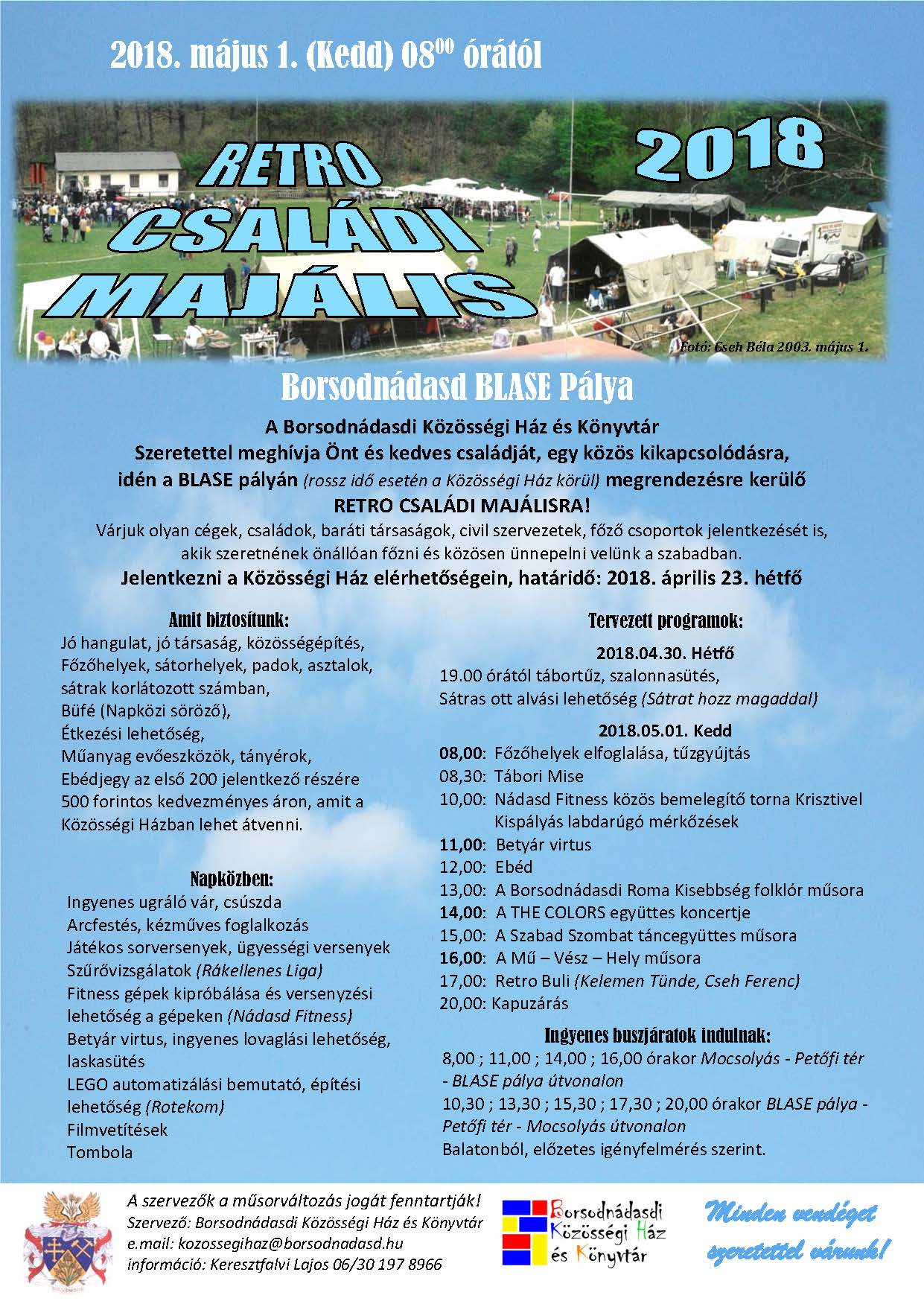 A Retro Családi Majális 2018 programja a jó időre való tekintettel a Borsodnádasd BLASE pályán kerül megrendezésre. Minden kedves érdeklődőt szeretettel várunk!