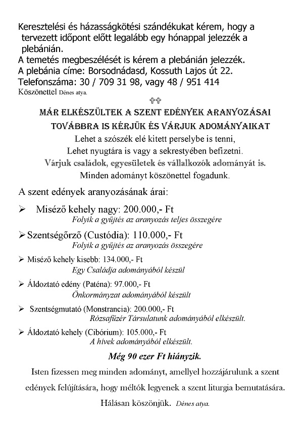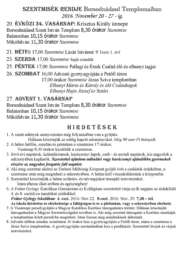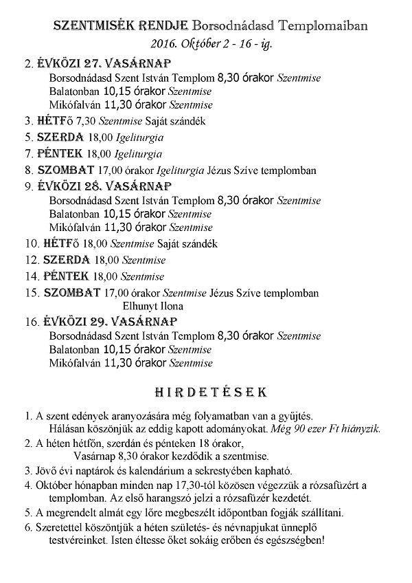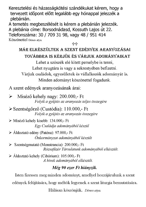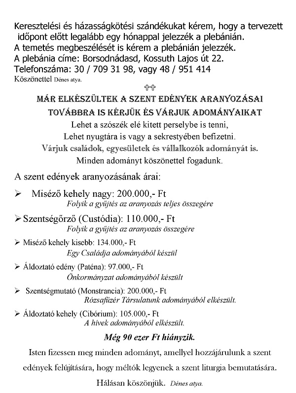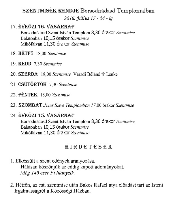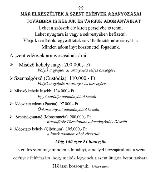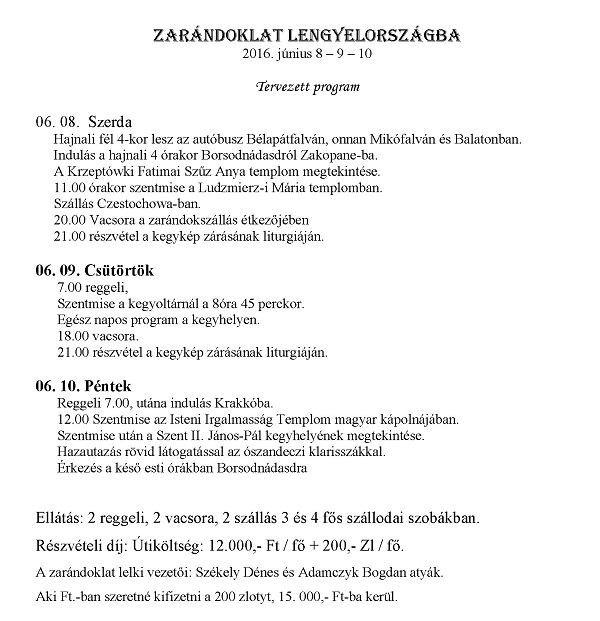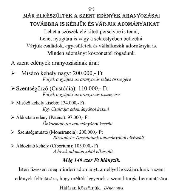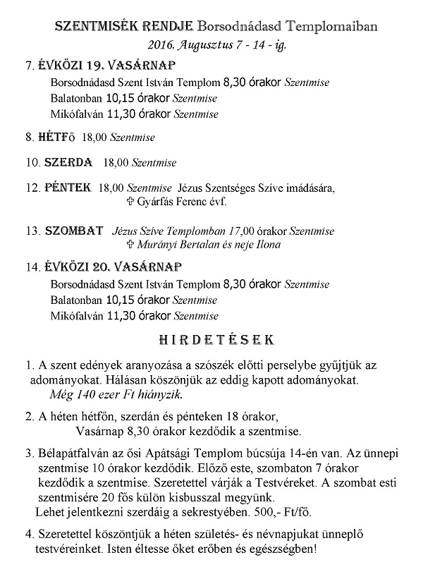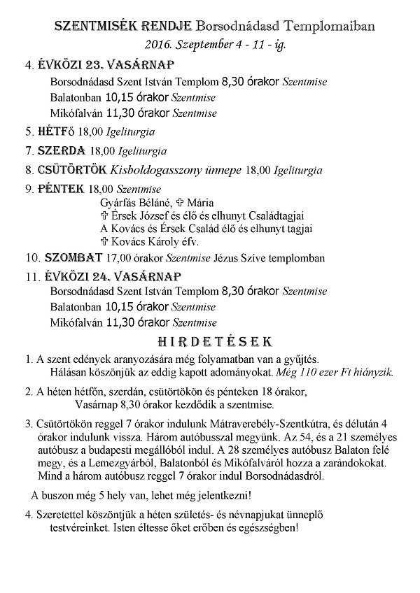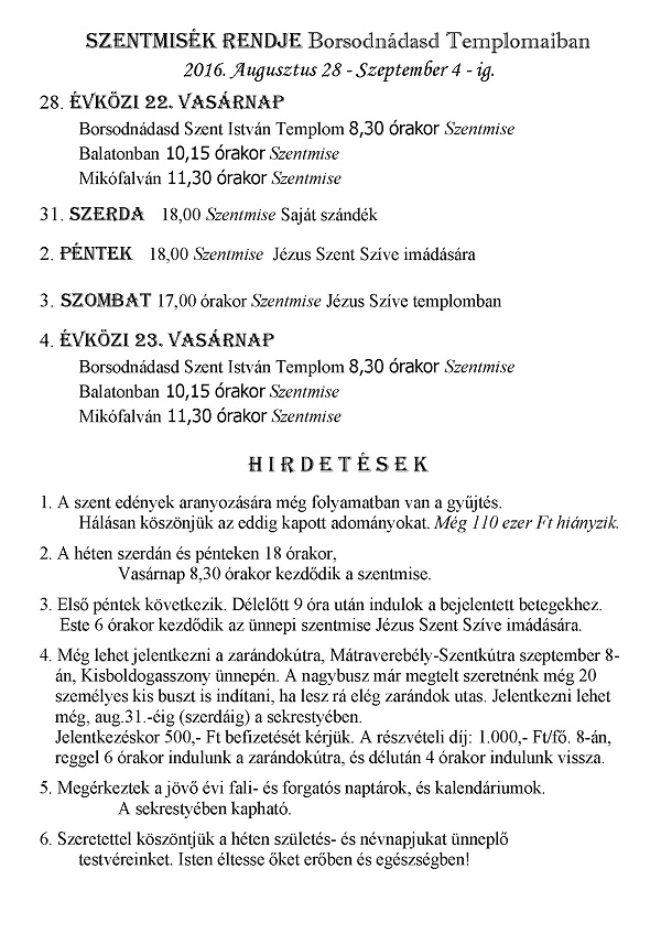 Zarándok utat szervezünk Mátraverebély-Szentkútra szeptember 8-án, Kisboldogasszony ünnepén. Jelentkezni lehet a sekrestyében augusztus 28-ig. Jelentkezéskor 500 Ft befizetését kérjük. A részvételi díj kb. 1.000,- Ft/fő lesz. Szeretettel várjuk a testvérek jelentkezését.